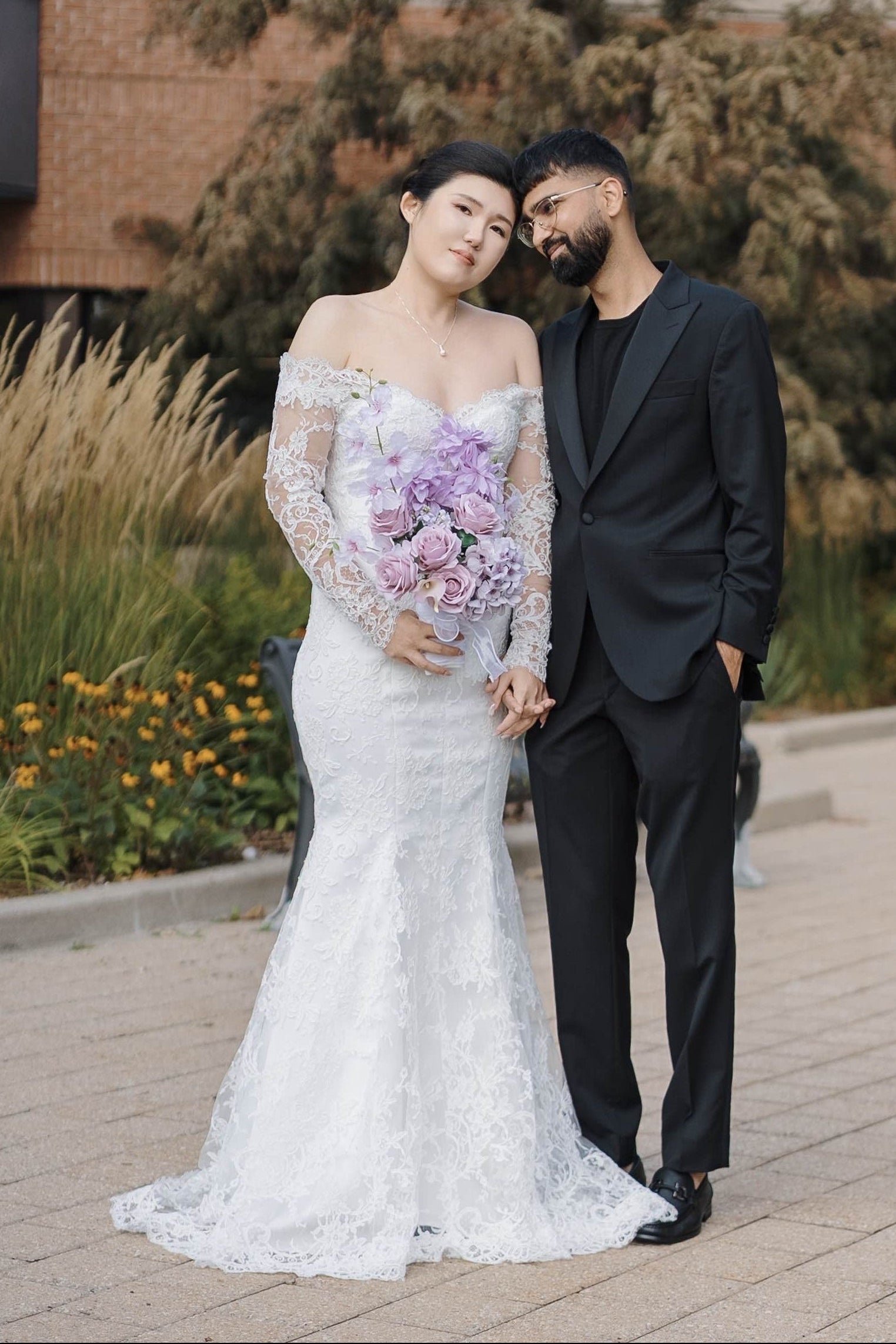 Featuring an off-the-shoulder neckline and scalloped lace trim, the bodice gently hugs the form before cascading into a soft, fluted hem—creating a statuesque shape that flatters and elongates. Delicate long sleeves add a touch of regality, while the intricate floral lacework whispers of candlelit halls and whispered vows.
