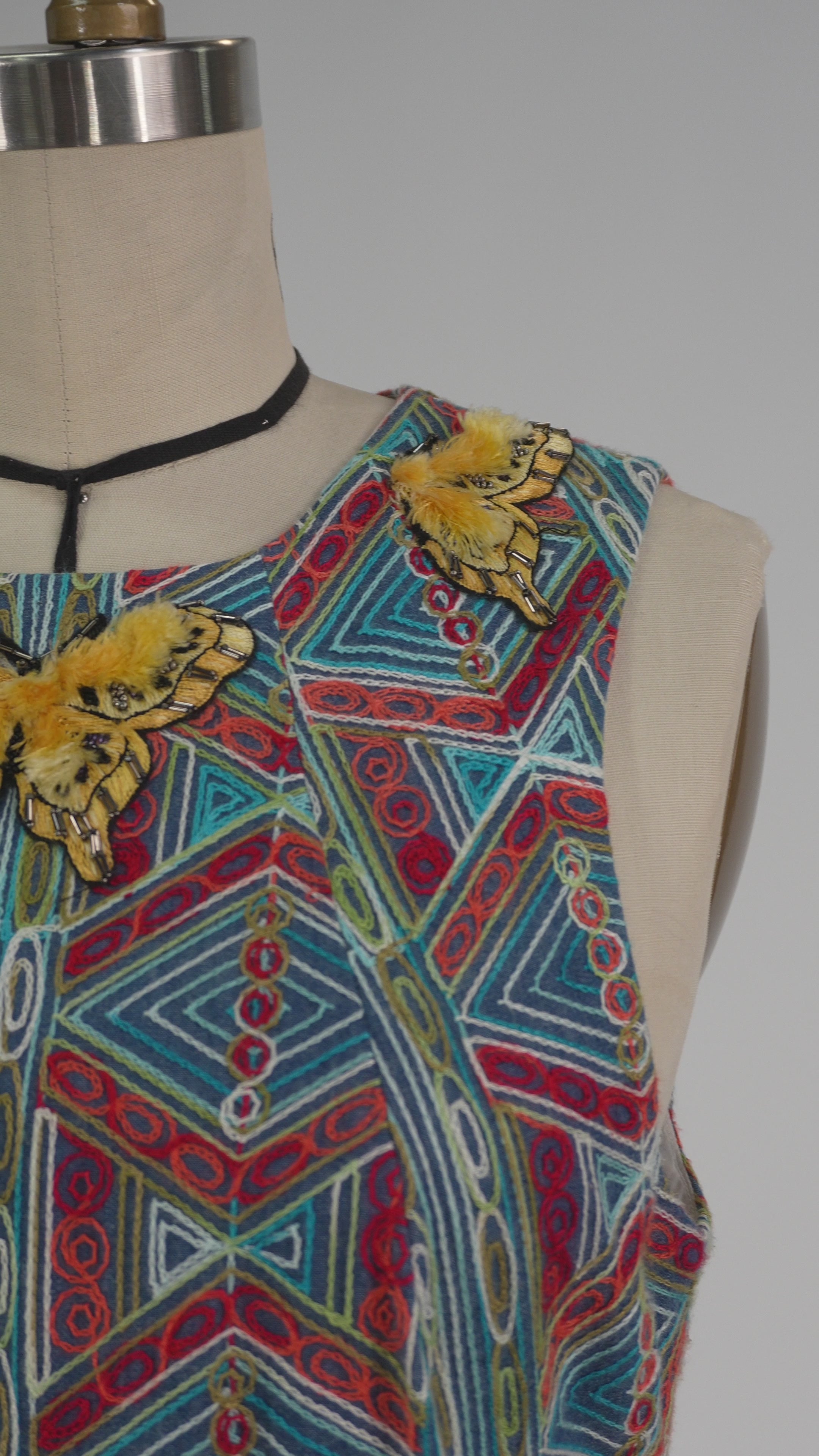 A statement piece from the Kiss the World collection, this geometric embroidered maxi dress celebrates love, culture, and global artistry. Featuring rich hand-stitched motifs in bold multicolor threads, it draws inspiration from architectural symmetry and cross-cultural design. Crafted in a structured yet breathable fabric, the pleated skirt flows gracefully with every step, while the sleeveless silhouette adds effortless modernity. Finished with intricate yellow floral accents at the neckline, this dress is a wearable tribute to craftsmanship and connection—perfect for gallery openings, cultural events, or elegant day soirées.