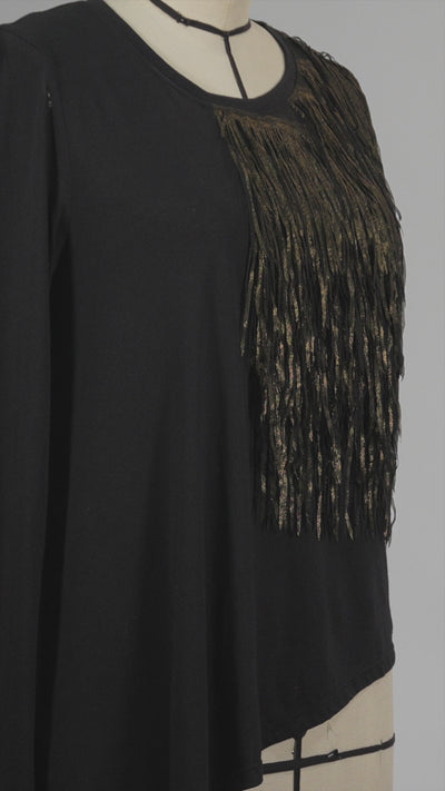 - Black long sleeve asymmetric top with gold metallic tassel