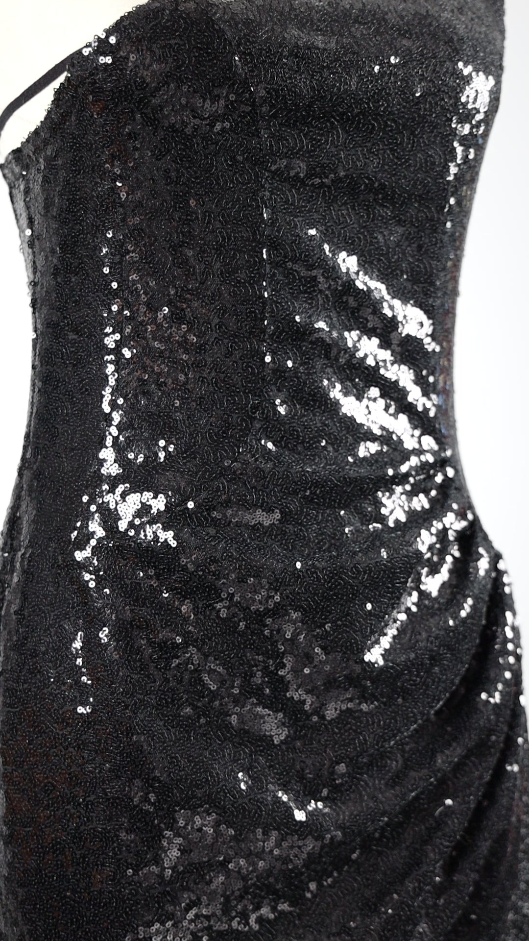 Command attention in the Noir Luminaire Gown, a masterpiece of effortless sophistication and allure. Crafted from opulent black sequin-embroidered silk blend, this one-shoulder silhouette shimmers with every movement. The sleek, form-fitting design features subtle side ruching, enhancing natural contours for a look of modern glamour.